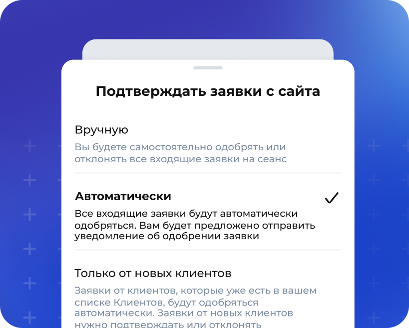 В Beauty Agent вы подтверждаете вручную все входящие заявки на сеанс — мы сделали это, чтобы вы всегда были уверены, что у вас всё под контролем. Однако теперь вы можете подтверждать некоторые заявки автоматически — например, от клиентов из вашего списка или только от тех, кто уже у вас был. Заявка подтвердится автоматически, а вам придёт уведомление с предложением отправить сообщение с подтверждением.