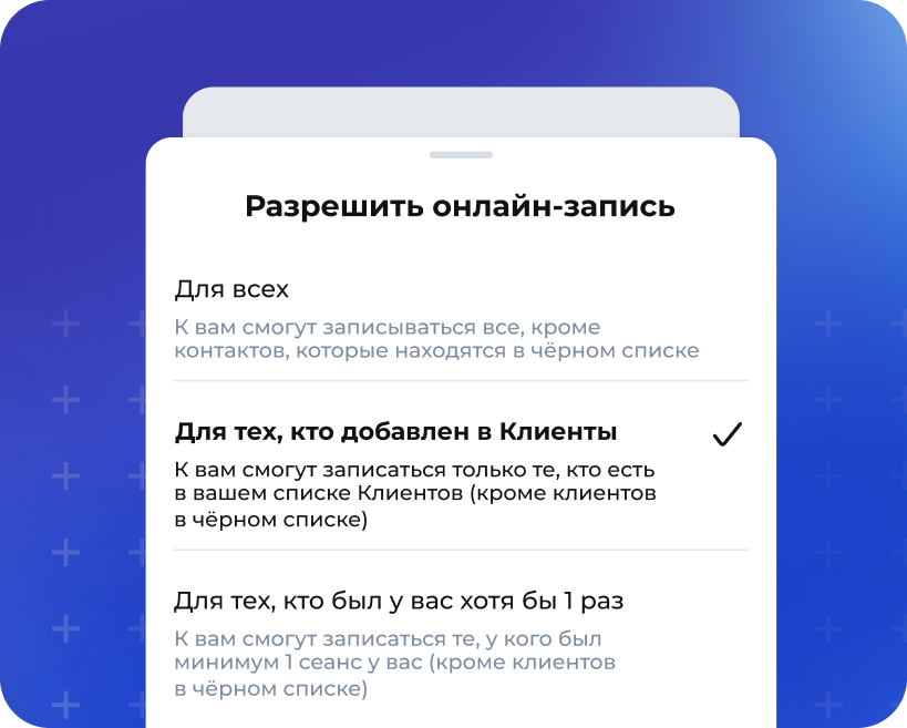 Если вы работаете только со своей клиентской базой или просто не хотите, чтобы к вам записывались незнакомцы, вы можете ограничить свою онлайн-запись. Клиенты, которых нет в вашем списке, не смогут записаться — они увидят сообщение «Мастер ограничил запись». А если вы не уверены в своей клиентской базе, вы можете разрешить записываться к вам онлайн только тем клиентам, которые уже посещали вас.